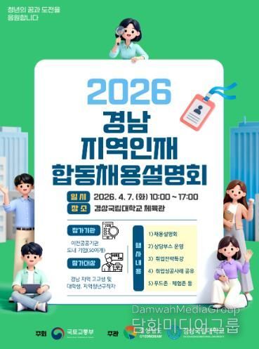 시민행정신문 강갑수 기자 | 경상국립대학교는 공공기관 및 기업 채용 정보를 제공하여 지역 청년들의 취업 기회를 확대하기 위해 4월 7일 오전 10시부터 오후 5시까지 가좌캠퍼스 체육관(월계관)에서 ‘2026년 경남·울산 지역인재 합동 채용설명회’를 개최한다.