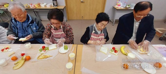요리교실에서는 뇌 건강에 도움이 되는 견과류를 활용한 ‘견과류 계란빵’과 면역력 강화에 좋은 신선한 과일을 활용한 ‘과일 샌드위치’를 함께 만들었다. 어르신들은 재료를 직접 손질하고 조리하는 과정을 통해 소근육을 자극하고 집중력을 높였으며, 가족들과 협력하며 자연스럽게 대화를 나누는 시간을 가졌다. 특히 간단하면서도 영양이 풍부한 메뉴로 가정에서도 쉽게 따라 할 수 있어 참여자들의 큰 호응을 얻었다.