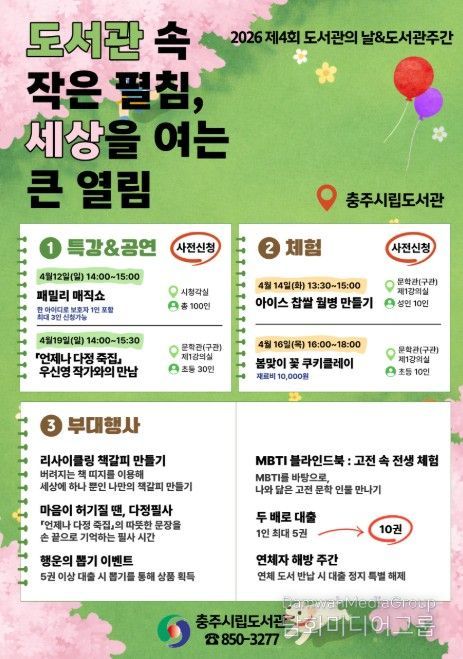 시민행정신문 기자 | 충주시립도서관은 제4회 도서관의 날과 제62회 도서관주간을 맞아 ‘도서관 속 작은 펼침, 세상을 여는 큰 열림’을 주제로 다양한 독서문화행사를 운영한다고 3일 밝혔다.
