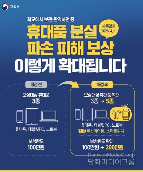 시민행정신문 장규호 기자 | 학교에서 보관·관리하던 중 휴대품 분실·파손 피해 보상 이렇게 확대됩니다.