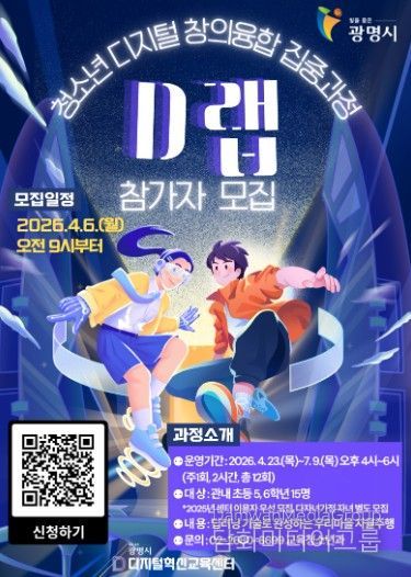 시민행정신문 강갑수 기자 | 광명시 디지털혁신교육센터가 지역 청소년들의 디지털 창의성과 인공지능(AI) 역량을 강화하기 위한 장기 교육 과정인 ‘2026 청소년 디지털 창의융합 집중과정 디(D)랩’ 참가자를 모집한다.