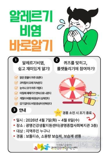 시민행정신문 기자 | 광명시는 시민 알레르기 질환에 대한 인식을 높이고 예방관리를 돕기 위해 오는 7일부터 8일까지 이틀간 ‘아토피·천식 예방관리사업 홍보부스’를 운영한다.