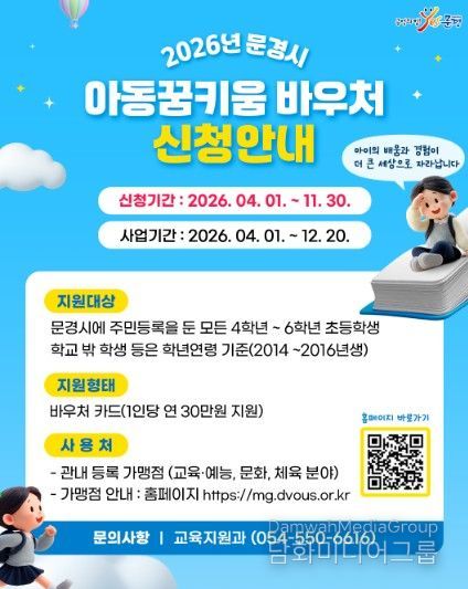 이번 사업은 문경시에 주민등록을 둔 초등학교 4학년부터 6학년까지 아동을 대상으로 하며, 약 1,200명이 혜택을 받을 예정이다. 1인당 연간 30만 원이 지원되는 맞춤형 복지 정책으로, 바우처는 전용 카드 형태로 지급되며 2026년 4월부터 12월 20일까지 사용할 수 있다.