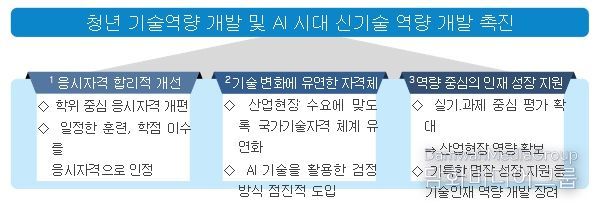고용노동부는 전문가들의 제언을 토대로 청년층 기회 확대를 위해 올해부터 국가기술자격 응시자격 등 제도 개선을 추진한다. 첫째, 기술사·기능장 등급 시험 응시를 위한 경력 기간을 합리적으로 조정한다. 현재 기술사·기능장 시험에 응시하기 위해서는 최대 9년의 경력이 요구되어 평균 44.8세에 기술사를 취득하는 등 고령화가 심화되고 있다. 이에, 더 많은 청년층이 신속히 기술사·기능장 등급에 진입할 수 있도록 경력 기간을 현행 대비 2~4년씩 단축한다.