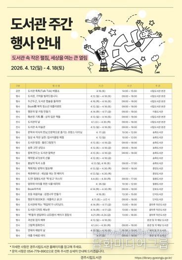 경주시립도서관 관계자는 “도서관 주간을 맞아 시민들이 책과 도서관을 더욱 가깝게 느낄 수 있도록 다양한 프로그램을 준비했다”며 “가족과 함께 도서관을 찾는 즐거운 시간이 되길 바란다”고 말했다.