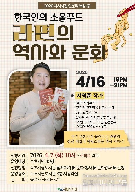 시민행정신문 기자 | 속초시립도서관은 4월 16일 19시 시청각실에서 속초시민 40여 명을 대상으로 사시사철 인문학 두 번째 프로그램 ‘한국인의 소울푸드, 라면의 역사와 문화’ 특강을 운영한다.