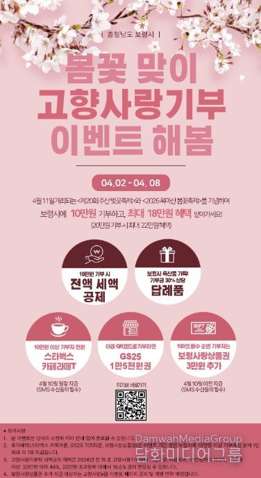 시민행정신문 강갑수 기자 | 보령시가 제20회 주산 벚꽃축제와 2026 옥마산 봄꽃축제를 맞아 오는 4월 8일까지 ‘봄꽃 맞이 고향사랑기부 이벤트 해봄’을 진행한다.
