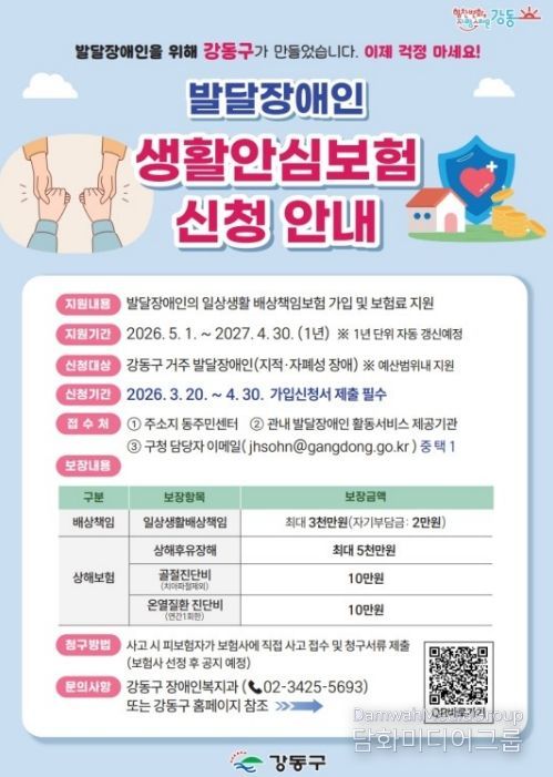 지원 대상은 강동구에 거주하면서 '장애인복지법'에 따라 등록된 발달장애인(지적·자폐성 장애인)이다. 오는 4월 30일까지 가입 신청서를 제출하면 되며, 보험료는 전액 무료다. 보장 기간은 2026년 5월 1일부터 2027년 4월 30일까지 1년이며, 이후 매년 1년 단위로 자동 갱신될 예정이다.