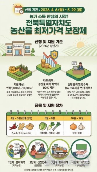 시민행정신문 강갑수 기자 | 전북특별자치도는 가격 변동성이 큰 농산물에 대한 경영안정 지원을 위해 ‘2026년 주요농산물 가격안정 지원사업’ 신청을 4월 6일부터 오는 5월 29일까지 접수한다.