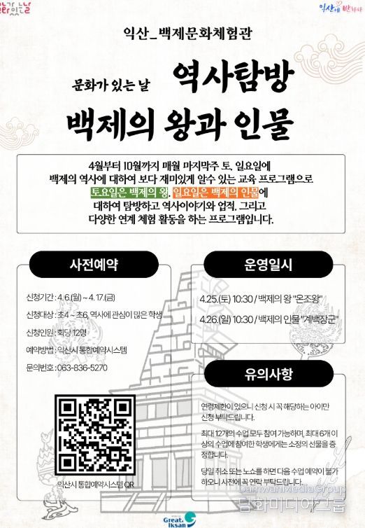 익산 백제문화체험관은 4월부터 10월까지 매월 마지막 주 토·일요일에 '역사탐방-백제의 왕과 인물'을 운영한다고 6일 밝혔다.