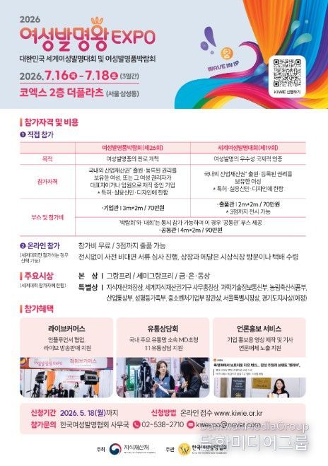 한편, 참가 신청은 산업재산권(특허·실용신안·디자인)을 출원하거나 등록한 여성이 대표 또는 임원으로 재직 중인 기업이면 가능하며, 여성발명왕EXPO 누리집에서 신청할 수 있다.