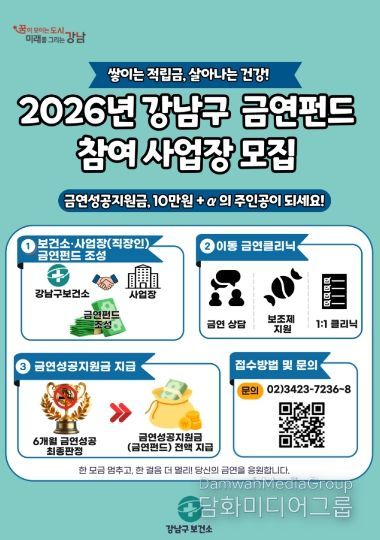 시민행정신문 이존영 기자 | 꿈이 모이는 도시, 미래를 그리는 강남구가 직장인의 자발적인 금연 실천을 유도하고 간접흡연 피해를 줄이기 위해 ‘2026년 사업장 금연펀드’ 참여기업을 모집한다. 보건소와 사업장, 직장인이 함께 금연펀드를 조성하고, 6개월 금연에 성공하면 적립금 전액을 지원금으로 돌려주는 방식이다.