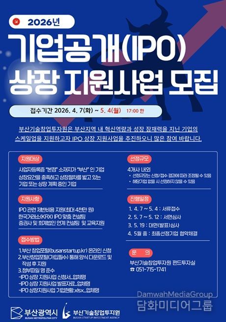 시민행정신문 이세훈 기자 | 부산시와 부산기술창업투자원은 부산 지역 기업의 기업공개(IPO) 상장 활성화를 위한 '2026년 기업공개(IPO) 상장 지원사업'에 참여할 기업을 오는 5월 4일까지 모집한다고 밝혔다.