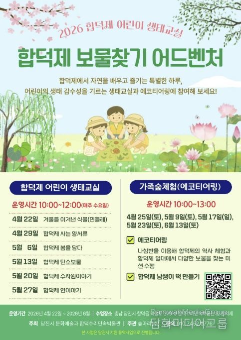 시민행정신문 강갑수 기자 | 당진시는 오는 6월까지 합덕제 야외 현장 및 합덕수리민속박물관에서 2026합덕제 어린이 생태교실 및 보물찾기 어드벤처 프로그램을 운영한다고 7일 밝혔다.