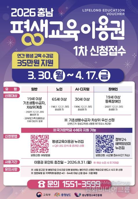 신청은 일반·디지털·노인 분야의 경우 평생교육 이용권 누리집에서 가능하며, 장애인 이용권은 정부24 누리집을 통해 온라인으로 신청할 수 있다. 또한 장애인 이용권은 예산군 평생학습관 방문 신청도 가능하다.