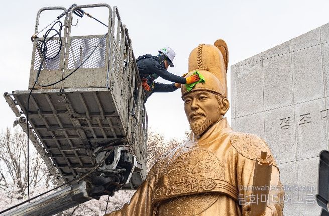 정조대왕 동상에 겨우내 쌓인 먼지와 오염물질을 고압세척기로 제거하고, 산화된 부분도 깨끗하게 정비했다. 물과 중성세제를 혼합한 세척액을 사용해 동상 표면을 청소하고, 부드러운 천으로 닦아 먼지와 녹을 말끔하게 제거했다.