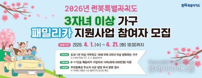 지원 대상은 공고일 기준 전북특별자치도에 1년 이상 계속 거주하면서 18세 이하 자녀 3명 이상을 양육하는 가구다.