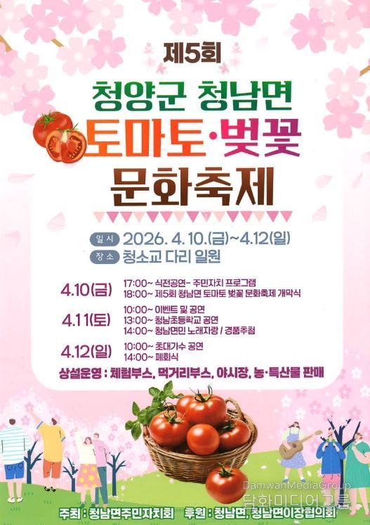이민구 주민자치회장은 “흐드러진 벚꽃 아래서 청남면의 따뜻한 정과 싱싱한 토마토의 맛을 꼭 느껴보시길 바란다”며 “전국에서 오시는 방문객들이 불편함 없이 축제를 즐길 수 있도록 준비에 최선을 다하겠다”고 말했다.