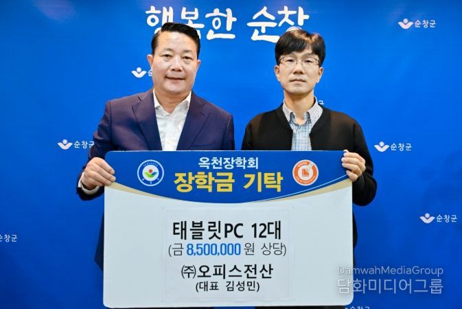 시민행정신문 강갑수 기자 | 순창군은 7일 ㈜오피스전산(대표 김성민)이 지역 학생들의 학습환경 개선을 위해 순창군옥천장학회(이사장 최영일 순창군수)에 태블릿PC 12대(약 850만 원 상당)를 기탁했다고 밝혔다.