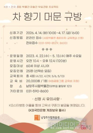 시민행정신문 기자 | 남양주시는 오는 22일부터 남양주시립박물관이 시니어 대상 체험 프로그램 ‘차 향기 머문 규방’ 운영하고, 이에 앞서 14일부터 참여 신청을 받는다고 7일 밝혔다.