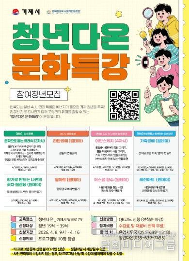 시민행정신문 기자 | 거제시는 청년문화공간 ‘청년다온(거제시 탑곡로 75)’에서 지역 청년들의 여가활동 지원과 문화 향유 기회 확대를 위한 '2026년 청년다온 문화특강' 수강생을 모집한다고 밝혔다.