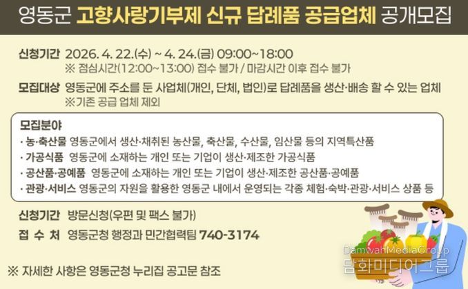 시민행정신문 이세훈 기자 | 충북 영동군이 2026년도 고향사랑기부제 신규 답례품 공급업체를 모집한다고 8일 밝혔다.