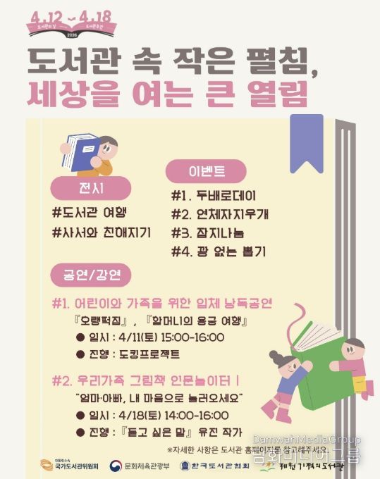 시민행정신문 강갑수 기자 | 제천기적의도서관은 제62회 도서관주간을 기념해 오는 4월 11일부터 19일까지 어린이와 가족이 함께 즐길 수 있는 다채로운 독서문화 프로그램과 이벤트를 운영한다.
