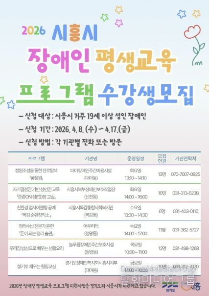 시민행정신문 강갑수 기자 | 시흥시가 관내 성인 장애인의 학습권 보장과 사회참여 확대를 위해 ‘2026년 장애인 평생교육 프로그램 지원사업’을 본격적으로 시작하며, 4월 8일부터 17일까지 프로그램 운영을 위한 학습자를 모집한다.