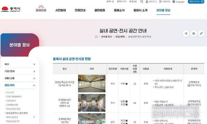 시민행정신문 강갑수 기자 | 동해시가 전시·공연이 가능한 실내 문화공간 정보를 시 홈페이지에서 한눈에 확인할 수 있도록 통합 안내 서비스를 제공한다.