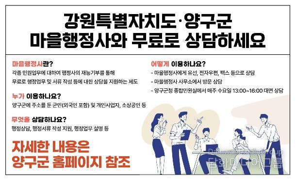마을행정사는 행정사의 재능기부를 통해 복잡한 행정 업무 및 서류 작성 등에 대해 무료로 상담을 지원하는 제도로, 양구군에 주소를 둔 군민은 물론 외국인, 개인사업자, 소상공인 등 행정 상담이 필요한 사람이라면 누구나 이용할 수 있다.