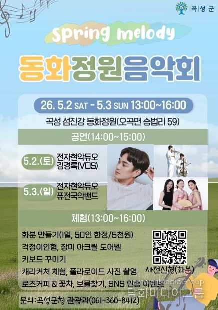 시민행정신문 강갑수 기자 | 전남 곡성군은 오는 5월 2일부터 5월 3일까지 2일간 곡성읍 묘천리 일원에 조성된 동화정원에서 ‘봄의 멜로디’ 음악회를 개최한다고 8일 밝혔다.