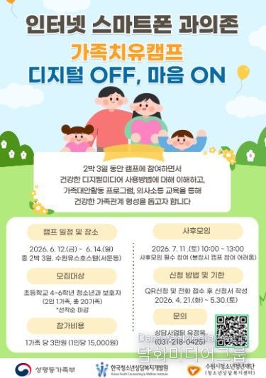 시민행정신문 기자 | 수원시청소년청년재단 소속 수원시청소년상담복지센터는 여성가족부가 주최하고 한국청소년상담복지개발원이 주관하는 2026년 인터넷·스마트폰 가족치유캠프의 운영기관으로 선정되어 오는 6월 12일부터 14일까지 2박 3일 동안 수원 유스호스텔에서 열릴 예정이다.