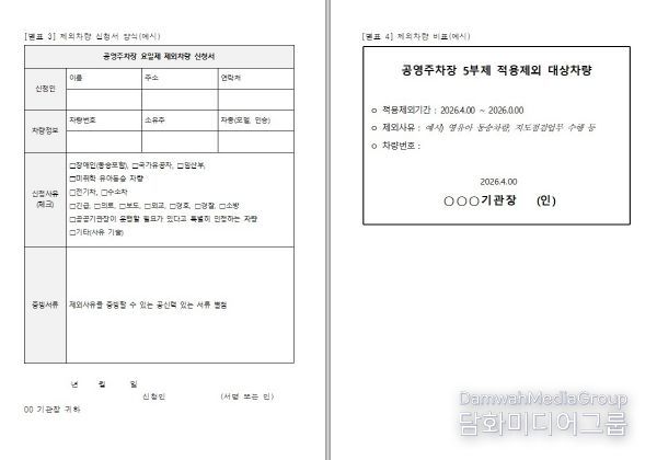 아울러 공단은 장애인·임산부 차량, 특수목적 차량, 전기차·수소차 등 불가피한 사유가 있는 경우를 고려하여 ‘공영주차장 요일제 제외차량 신청서’를 통해 제외차량을 운영할 계획이다. 해당 차량은 각 주차장 관리사무소에 방문하여 신청서를 작성하면, 내용 확인 후 ‘제외차량 비표’를 발급받아 이용할 수 있다.