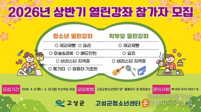시민행정신문 강갑수 기자 | 고성군청소년센터“온”은 지역 청소년과 학부모를 대상으로 ‘2026년 상반기 열린강좌’ 참가자를 모집하고 있다고 밝혔다.