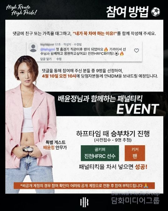 이날 현장에서는 경기 하프타임을 활용해 인기 안무가 배윤정 씨와 함께하는 승부차기 이벤트도 진행될 예정이다.