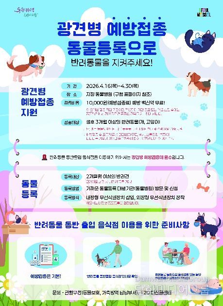 구는 오는 4월 16일부터 30일까지 관내 지정 동물병원 35개소에서 ‘광견병 예방접종’을 실시한다. 광견병은 치사율이 높고 사람에게도 전염될 수 있어, 가족과 이웃의 안전을 위해 매년 1회 예방접종을 권고하고 있다.