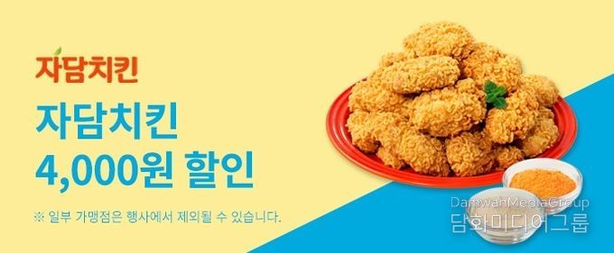 치킨은 4월 배달특급에 신규 입점한 꾸부라꼬숯불치킨을 비롯해 부어치킨, 치킨플러스, 땅땅치킨, 호식이두마리치킨, 기영이숯불두마리치킨, 해두리치킨, 누구나홀딱반한닭, 자담치킨 9곳에서 회원 전용 3~5천 원 할인 쿠폰을 발급한다.