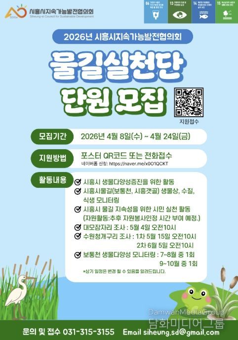 시민행정신문 강갑수 기자 | 시흥시지속가능발전협의회는 시흥시 물길(보통천ㆍ시흥갯골)의 생태 현황을 파악하고 시민들의 환경 인식을 높이기 위해 ‘2026년 물길실천단’ 단원 10명을 오는 4월 24일까지 모집한다.