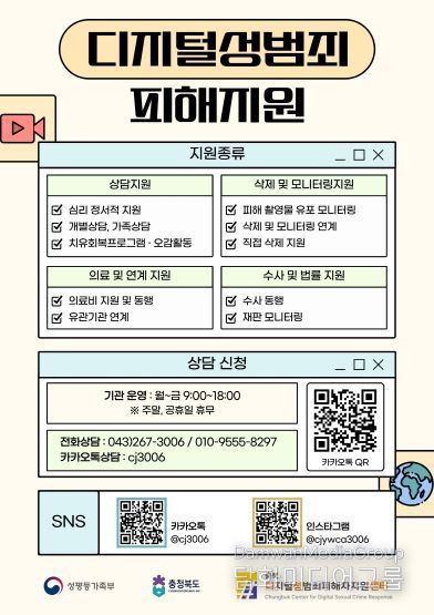 충북디지털성범죄피해자지원센터는 불법촬영물 삭제 지원을 비롯해 상담, 치료·회복 프로그램, 수사·법률 연계, 의료 지원 등 피해자 맞춤형 서비스를 제공하고 있으며, 2026년 1분기 기준 총 217건의 피해자를 지원했다. 주요 지원내용은 상담 135건, 삭제 지원 28건, 치료·회복 프로그램 30건, 수사·법률 지원 7건, 의료 지원 17건 등으로 나타났다.