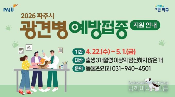 시는 광견병 예방 백신 7,000마리분을 무상 지원하며, 예방접종을 희망하는 반려견 보호자는 36개 지정 동물병원을 방문해 시술비 1만 원만 부담하면 접종이 가능하다. 참여 동물병원 목록은 파주시청 누리집에 게시된 공고문을 통해 확인할 수 있다.