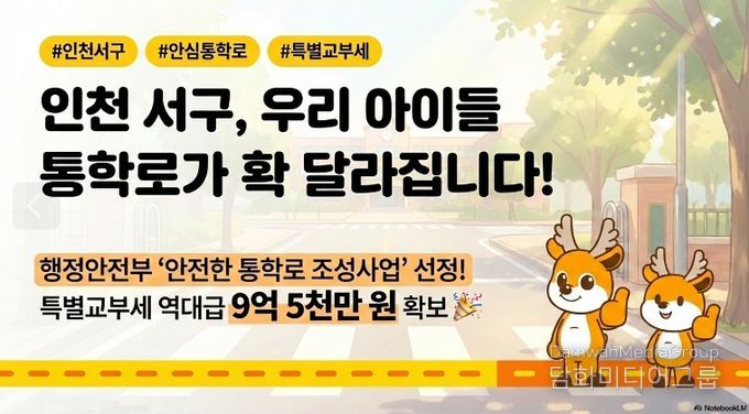 시민행정신문 강갑수 기자 | 인천 서구는 행정안전부 주관 ‘안전한 통학로 조성사업’에 선정되어 사업 추진을 위한 특별교부세 9.5억 원을 확보했다고 밝혔다.