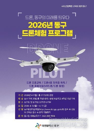시민행정신문 강갑수 기자 | 대전 동구는 4월부터 오는 11월까지 구청과 동구 청소년자연수련원에서 ‘2026년 드론체험 프로그램’을 운영한다고 9일 밝혔다.