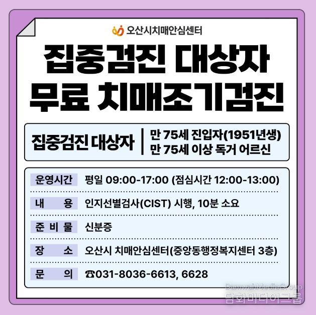 김태숙 오산시보건소장은 “치매는 조기 발견과 꾸준한 관리가 무엇보다 중요한 질환”이라며 “이번 집중검진 대상 어르신들께서는 부담 없이 검진에 참여해 주시길 바란다”고 말했다.