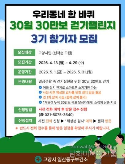 시민행정신문 기자 | 고양특례시 일산동구보건소는‘우리동네 한 바퀴 30일 30만보 걷기 챌린지’ 3기 참가자를 오는 13일부터 모집한다. 해당 프로그램은 지역 주민의 기초 체력 증진과 일상 속 신체활동 활성화를 위해 진행한다.