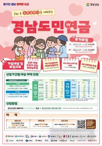 시민행정신문 강갑수 기자 | 거창군은 소득 공백기 대비와 안정적인 노후 준비를 지원하기 위해 ‘2026년 경남도민연금 가입자 추가모집’을 오는 4월 20일부터 30일까지 실시한다.