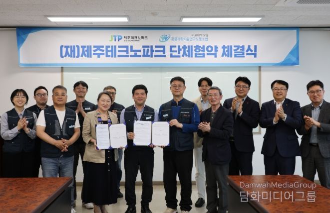 제주TP는 8일 오후 제주벤처마루에서 지영흔 제주TP 원장과 최연택 공공과학기술연구노동조합 위원장 등 노사 관계자들이 참석한 가운데 단체협약 체결식을 진행했다고 밝혔다.