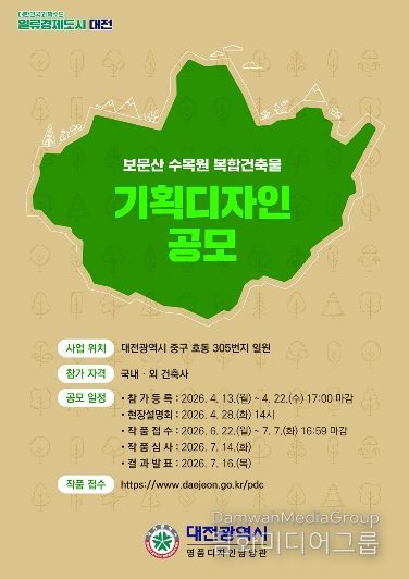 시민행정신문 강갑수 기자 | 대전시는 보문산의 자연자원을 활용한 산림형 수목원 조성을 위해 ‘보문산수목원 복합건축물 및 기타시설’ 기획디자인 국제 일반공모를 시행한다.