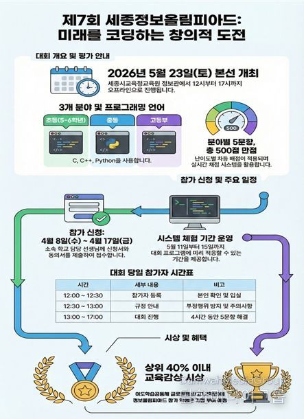 시민행정신문 기자 | 세종특별자치시교육청은 학생들의 논리적 사고력과 창의적 문제해결력을 함양하기 위해 ‘제7회 세종정보올림피아드 대회’를 개최한다.