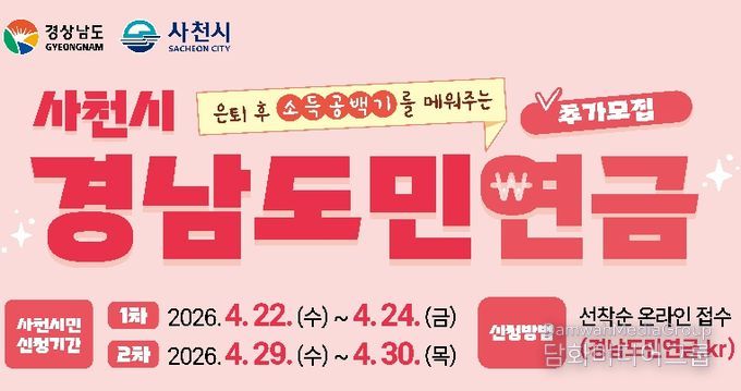 시민행정신문 강갑수 기자 | 사천시가 은퇴 후 소득 공백기를 대비하기 위한 ‘2026년 경남도민연금 지원사업’ 가입자를 추가 모집한다고 10일 밝혔다.