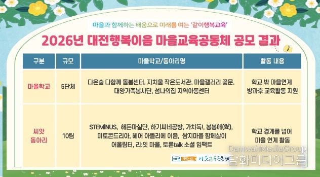 시민행정신문 기자 | 대전시교육청은 지역사회와 함께 성장하는 마을교육공동체 활성화를 위해 2026년 대전행복이음 마을학교와 씨앗동아리를 최종 선정했다고 밝혔다.